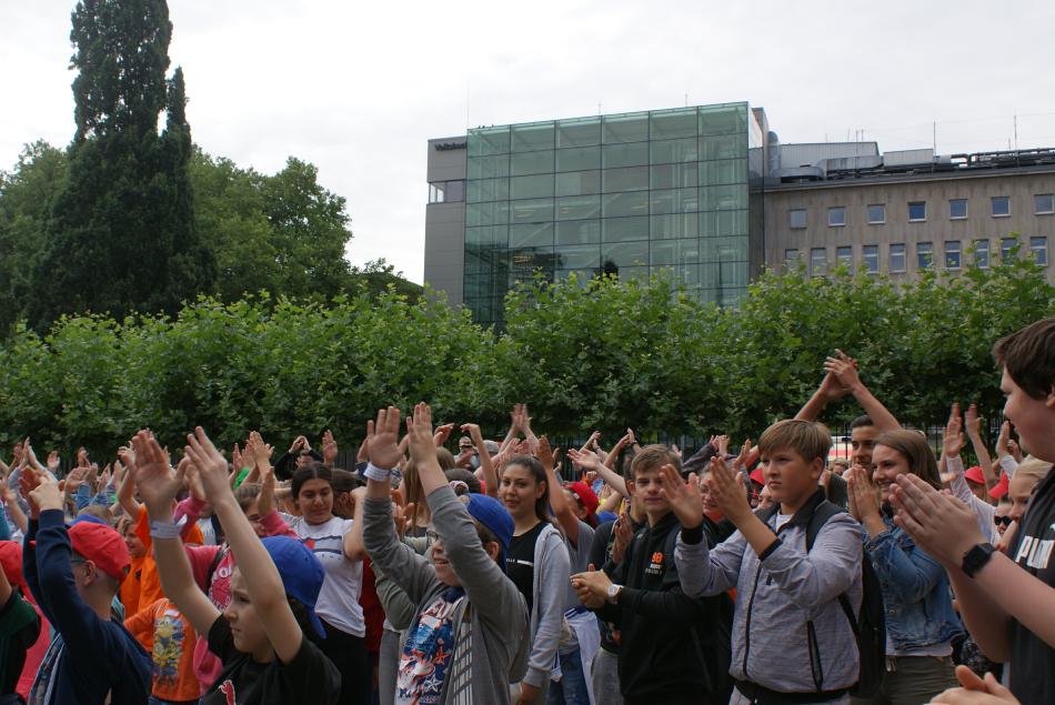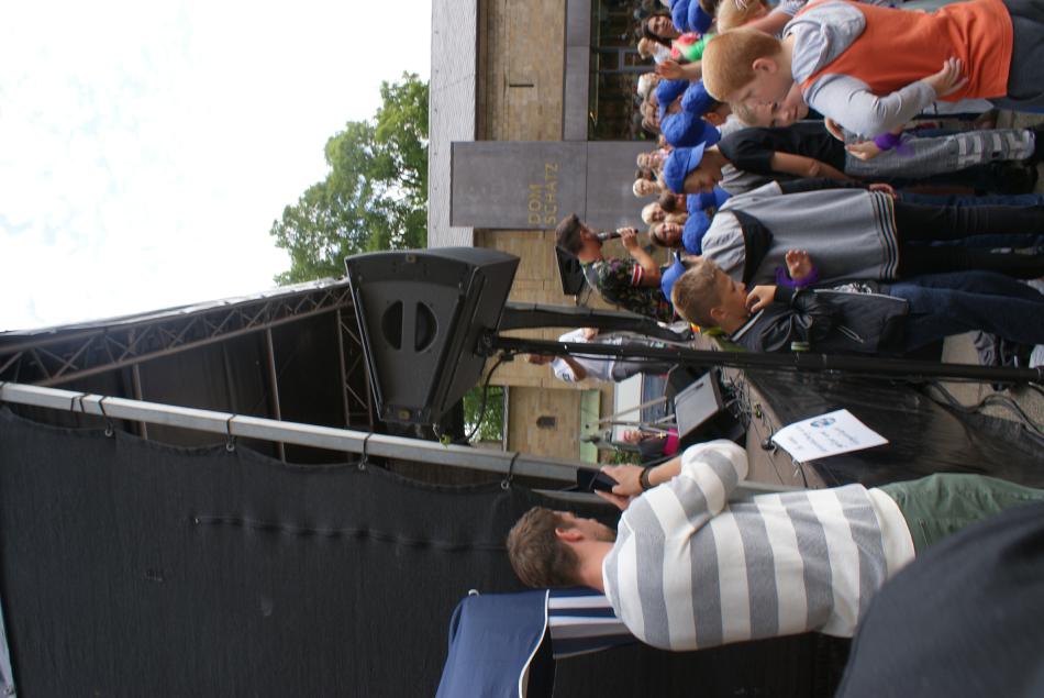 Im April 2018 hatten uns die Tanztrainer Hanno und Annka vom Verein „Funky e.V.“ besucht und mit uns einen Flashmob-Tanz eingeübt, den wir dann am Mittwoch, 11.7. 2018, mitten auf dem Domplatz zusammen mit ungefähr 400 anderen Jugendlichen von verschiedenen Schulen aufführen sollten. Auf dem Platz war eine Bühne aufgebaut, von der aus uns der Essener Weihbischof begrüßte. Auch Hanno und Annka sorgten wieder für super gute Laune mit cooler Musik. Mit den beiden tanzten wir uns wieder den Schweiß auf die Stirn. Für den kleinen Hunger und großen Durst gab es dann etwas von der Verpflegungsstation.