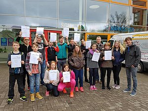 Es freuen sich von hinten links: Justin Schröder, Timo Giese, Christopher Ortwein, Justin Kalle, David Hermstein, Daniele Scimeca, Noah Schmidt, Filippo Karayaz, Jessica Flormann, Franziska Roß, Michelle Daub, Nymet Kaya, [...], Frau Lampe BfD`lerin und die beiden Lehrer Florian Weber-Kaesler, Manfred Geisenberger.