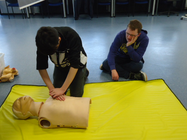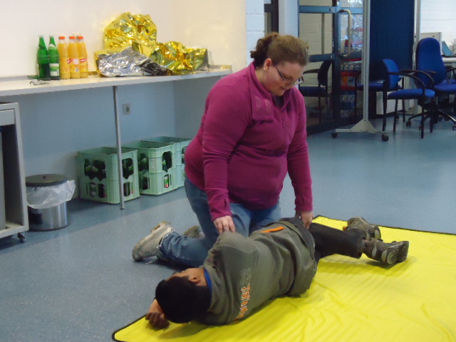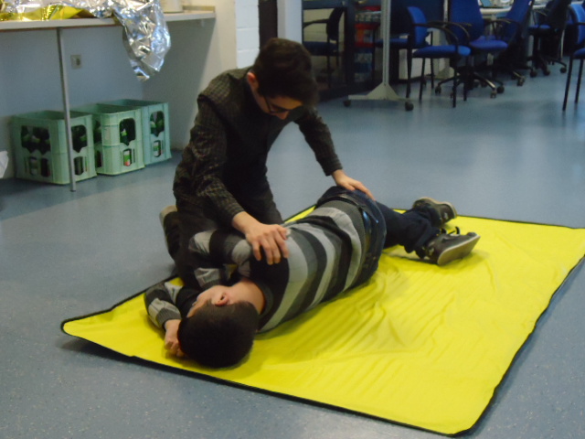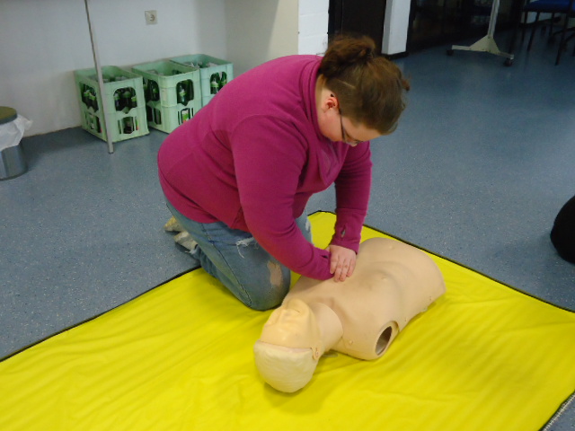 Wir, die Schüler der Oberstufe 4, möchten anderen Menschen im Notfall helfen können - vielleicht sogar Leben retten. Herr Winciers vom DRK hat unseren Erste-Hilfe-Kurs geleitet. Von Verbänden, der stabilen Seitenlage bis hin zur Herzdruckmassage haben wir Vieles gelernt, wie auf den Fotos zu sehen ist.
